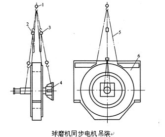 如下球磨機(jī)同步電機(jī)吊裝圖所示。以行車吊起球磨機(jī)同步電機(jī)平穩(wěn)地落在兩個轉(zhuǎn)子軸瓦上,并安上軸承上蓋。