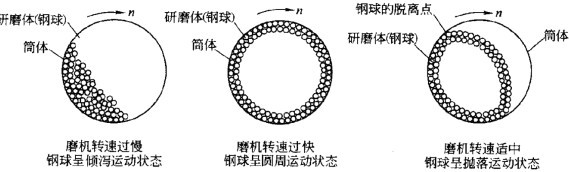 1)、當筒體轉(zhuǎn)速過低時,不能將研磨體帶到較高高度,研磨體和物料隨即因重力作用產(chǎn)生下滑,呈傾瀉運動狀態(tài),對物料的沖擊作用很小,幾乎只起到研磨作用,因而粉磨效果不佳,生產(chǎn)能力降低。