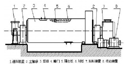 臥式筒形旋轉(zhuǎn)裝置,外沿齒輪傳動(dòng),兩倉(cāng),格子型球磨機(jī)。物料由進(jìn)料裝置經(jīng)入料中空軸螺旋均勻地進(jìn)入球磨機(jī)第一倉(cāng),該倉(cāng)內(nèi)有階梯襯板或波紋襯板,內(nèi)裝不同規(guī)格鋼球,筒體轉(zhuǎn)動(dòng)產(chǎn)生離心力將鋼球帶到一定高度后落下,對(duì)物料產(chǎn)生重?fù)艉脱心プ饔谩N锪显诘谝粋}(cāng)達(dá)到粗磨后,經(jīng)單層隔倉(cāng)板進(jìn)入第二倉(cāng),該倉(cāng)內(nèi)鑲有平襯板,內(nèi)有鋼球,將物料進(jìn)一步研磨。粉狀物通過(guò)卸料箅板排出,完成粉磨作業(yè)。