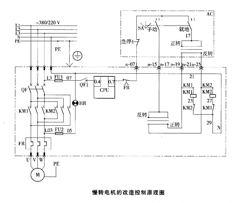 球磨機(jī)慢轉(zhuǎn)電機(jī)由單向轉(zhuǎn)動(dòng)改為雙向轉(zhuǎn)動(dòng),實(shí)現(xiàn)電機(jī)正反轉(zhuǎn)。當(dāng)離合器工作面被卡死的時(shí)候,我們可以讓電機(jī)進(jìn)行反轉(zhuǎn),調(diào)節(jié)爪子之間的間隙;當(dāng)離合器非工作面卡死的時(shí)候,我們可以讓電機(jī)進(jìn)行正轉(zhuǎn),調(diào)節(jié)聯(lián)軸器直齒輪的間隙,實(shí)現(xiàn)伸縮器的自由分離。同時(shí)實(shí)現(xiàn)電機(jī)正反轉(zhuǎn),為檢修帶來方便。