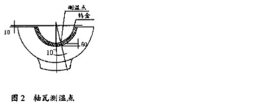 現(xiàn)有的磨機大多有溫度監(jiān)控報警裝置,但其軸瓦溫度測點安裝在軸瓦鎢金層下方的鑄鐵件內(nèi),測點距鎢金底層約50mm。顯然,由于測溫點的溫度梯度通常為dT/dr=常數(shù),也就是說,測溫點距軸瓦鎢金層越遠,溫度差也越大,測點距鎢金底層50mm遠時,其測試的溫度不能準確反映軸頸與軸瓦之間的真實溫度,比如:當測試溫度是50度時,軸頸與軸瓦之間的真實溫度可能是60度或以上,軸瓦勢必發(fā)生燒損。其改進辦法就是將測溫點安排在軸瓦承載區(qū)的鎢金層內(nèi),如圖2所示,經(jīng)試驗其測溫準確,當濕度升高到報警溫度時,停磨檢査,未發(fā)現(xiàn)燒瓦現(xiàn)象。