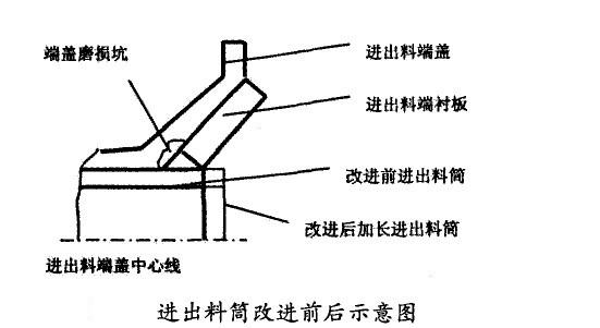 根據(jù)分析,將進出料筒加長可以解決。加長的數(shù)值受球磨機端襯板與簡體襯板鑲鋪空間的限制,不能加的太長,加長了影響筒體襯板的鑲鋪,太短了,不能較好地將礦漿送到簡體內(nèi)。因此,加長的長度應(yīng)稍大于端襯板的厚度即可,由于端襯板厚度為60 mm,所以加長長度為70~80 mm左右。