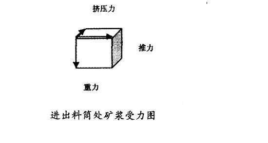 設(shè)計時都認為:礦漿有流速,有一定的前沖量,于是進出料筒與襯板平齊即可。但由于在給礦端,礦漿濃度大,運動粘度大,前沖量并不大,而且受簡體內(nèi)礦漿及鋼球旋轉(zhuǎn)的橫向力作用,礦漿并不能平滑的被送到簡體內(nèi)。礦漿受力的作用如下圖所示。