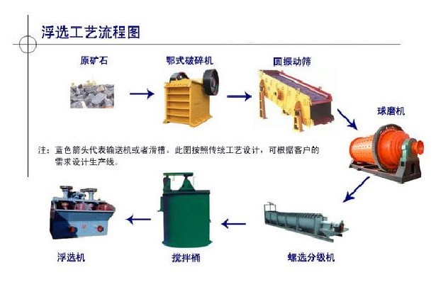 浮選選礦設(shè)備有:給料機(jī)、破碎機(jī)、振動(dòng)篩、球磨機(jī)、分級機(jī)、攪拌桶、浮選機(jī)、烘干機(jī)等