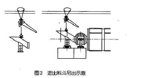 1、手動葫蘆將球磨機懸掛在鋼絲繩上,卸掉球磨機進出料斗的連接螺栓后吊出(詳細見下圖2),這樣便于筒體內(nèi)的空氣流通。