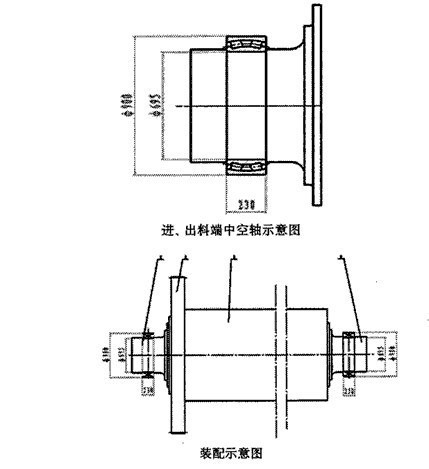 而滾動(dòng)軸承外圈不旋轉(zhuǎn),承受方向固定的徑向載荷,所以外圈是局部負(fù)荷。軸承外圈與軸承座的配合應(yīng)選用間隙配合,軸承外圈可沿軸向滑動(dòng),也可以繞軸線轉(zhuǎn)動(dòng)。為了補(bǔ)償筒體軸向伸縮變形,把筒體的一端承設(shè)計(jì)為自由支承。為了保證齒輪的正確嚙合,不讓卸料端中空軸有軸向竄動(dòng),而使伸縮的預(yù)留間隙設(shè)在進(jìn)料端。當(dāng)筒體受熱伸長后,自由端的軸承外圈可沿軸承座滑動(dòng),減少筒體及端蓋的軸向內(nèi)力,以適應(yīng)筒體受熱伸長后的串動(dòng)。